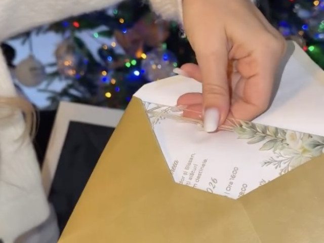 Mireasa a prezentat invitațiile, alegând un design modern din sticlă, care va fi transmis electronic dar și fizic, în plicuri aurii cu sigiliu. Petrecerea se va desfășura într-un local impresionant din Buftea.