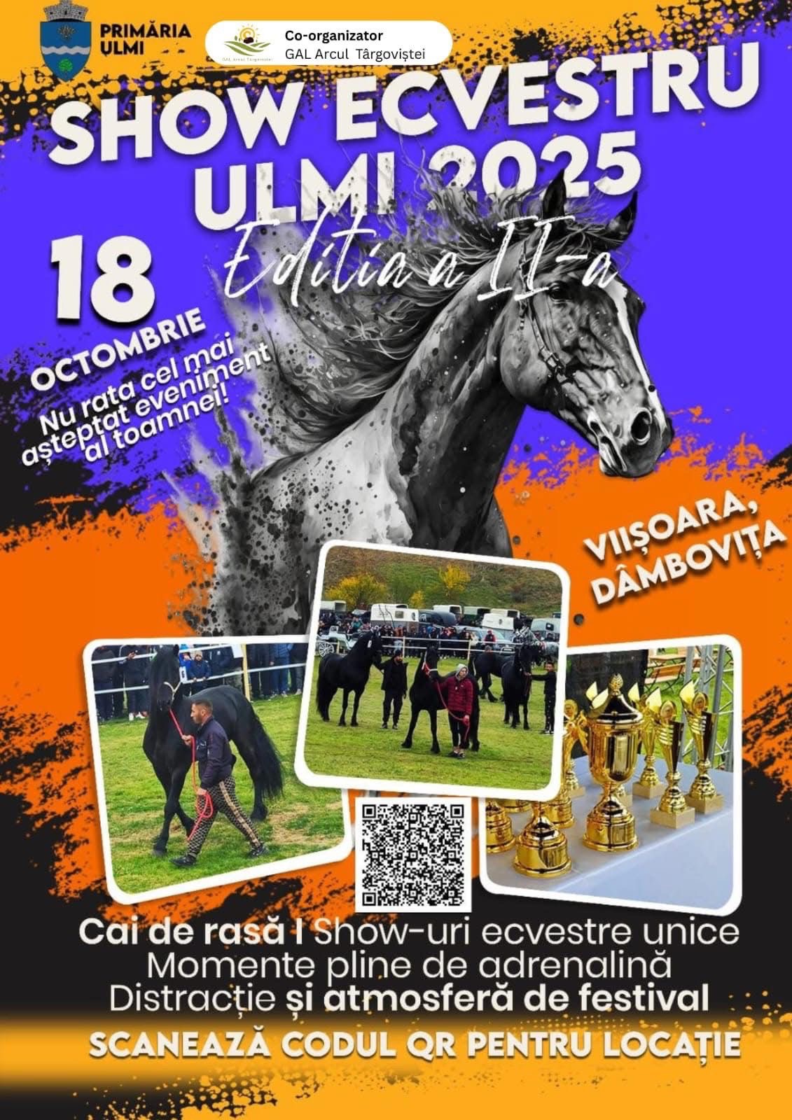 Astăzi, 18 octombrie 2025, pe islazul din satul Viișoara, comuna Ulmi, are loc cea de-a doua ediție a „Show-ului Ecvestru Ulmi”, eveniment care adună crescători, pasionați de cai și vizitatori din întreg județul Dâmbovița.